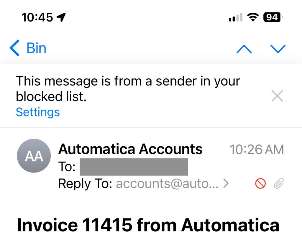 Somehow the user had inadvertently added the sender to the block list - which meant that whenever iOS saw an email from this sender, it put it in the bin. This was particularly frustrating as I use Xero, so the emails come from [email protected], so all of this clients suppliers who used Xero ended up with their invoices in the bin.